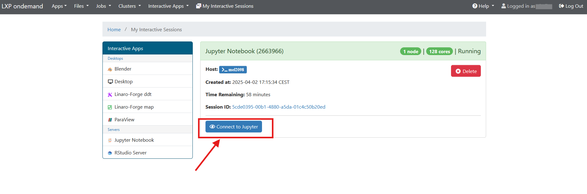 Once selected, Open Ondemand will request you to first configure a related job (kindly see How to launch a Desktop Application). Once the job is running on MeuXina, you can click on 'Connect to Jupyter' :
